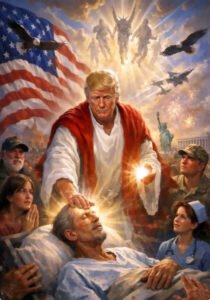 وكان ترامب يمسك في الصورة بكرة متوهجة في إحدى يديه ويلمس بيده الأخرى جبين رجل بدا مريضا بينما ظهر في الخلفية تمثال الحرية وألعاب نارية وطائرة مقاتلة ونسور.